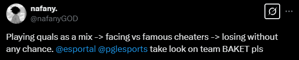 nafany抱怨在公开预选赛遇到作弊者:PGL,请关注下BAKET