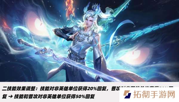 二技能对非英雄单位获得20%回复上调至50%回复,强化普攻对非英雄单位50%回复不变。