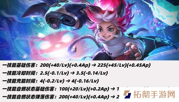 此次上调了一技能25-50点和0.05AP伤害,上调自燃状态一技能75-150点和0.15AP伤害,小幅上调了一技能冷却时间和充能时间。